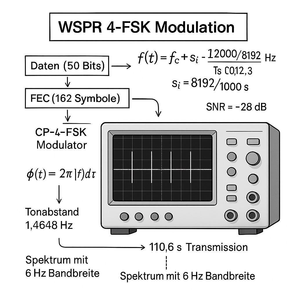 WSPR verwendet 4-FSK, also eine Frequenzumtastung mit vier verschiedenen Tonfrequenzen.
