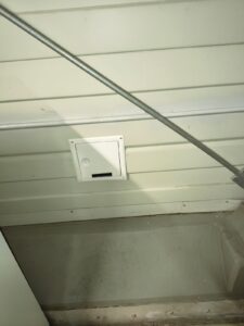 Die dritte Wanddurchführung wurde am 16.10.2025 durch Klaus und Rolf realisiert. Durch diese zusätzliche Öffnung nach Außen, werden zukünftig die Kabel für z.B. WebSDR, Satelliten durchgeführt. Die Durchführung befindet sich an der Südwest-Ecke des Dachaufbaus, in dem sich unserer Raum befindet. Das Foto zeigt die Innenklappe der Durchführung.