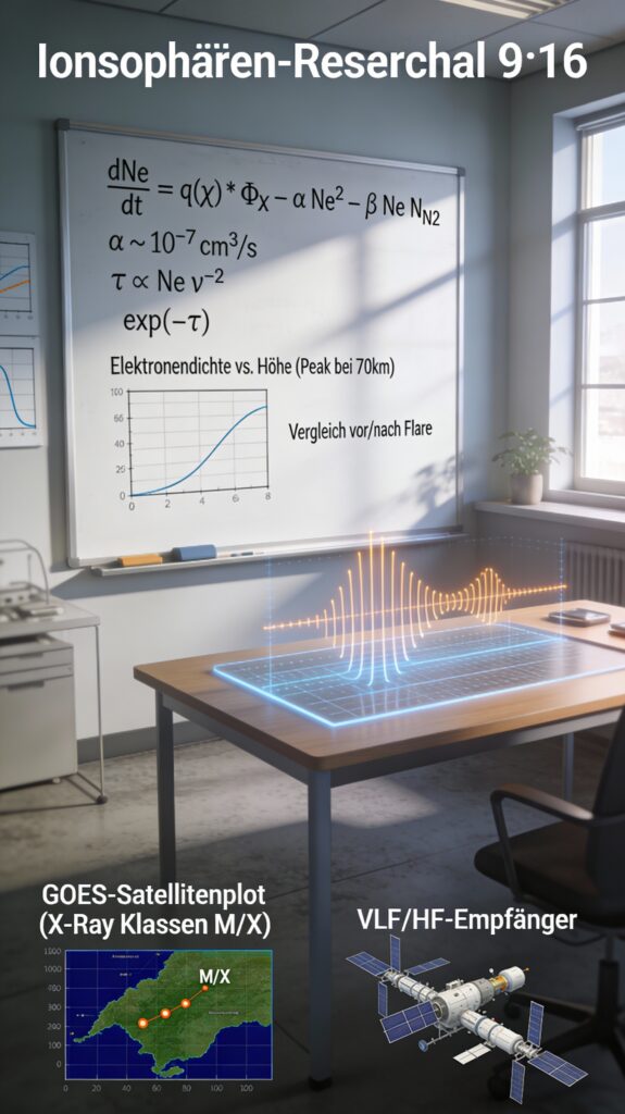 Die Sonne schickt einen Röntgenblitz → Die D‑Schicht wird überaktiv → HF wird absorbiert → Kurzwelle stirbt → Funkamateur flucht.