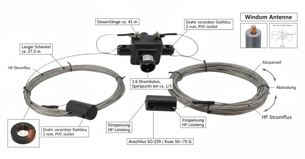 Die Windom ist im Kern ein Dipol, der nicht in der Mitte, sondern asymmetrisch gespeist wird – typischerweise bei etwa 1/3 der Gesamtlänge.